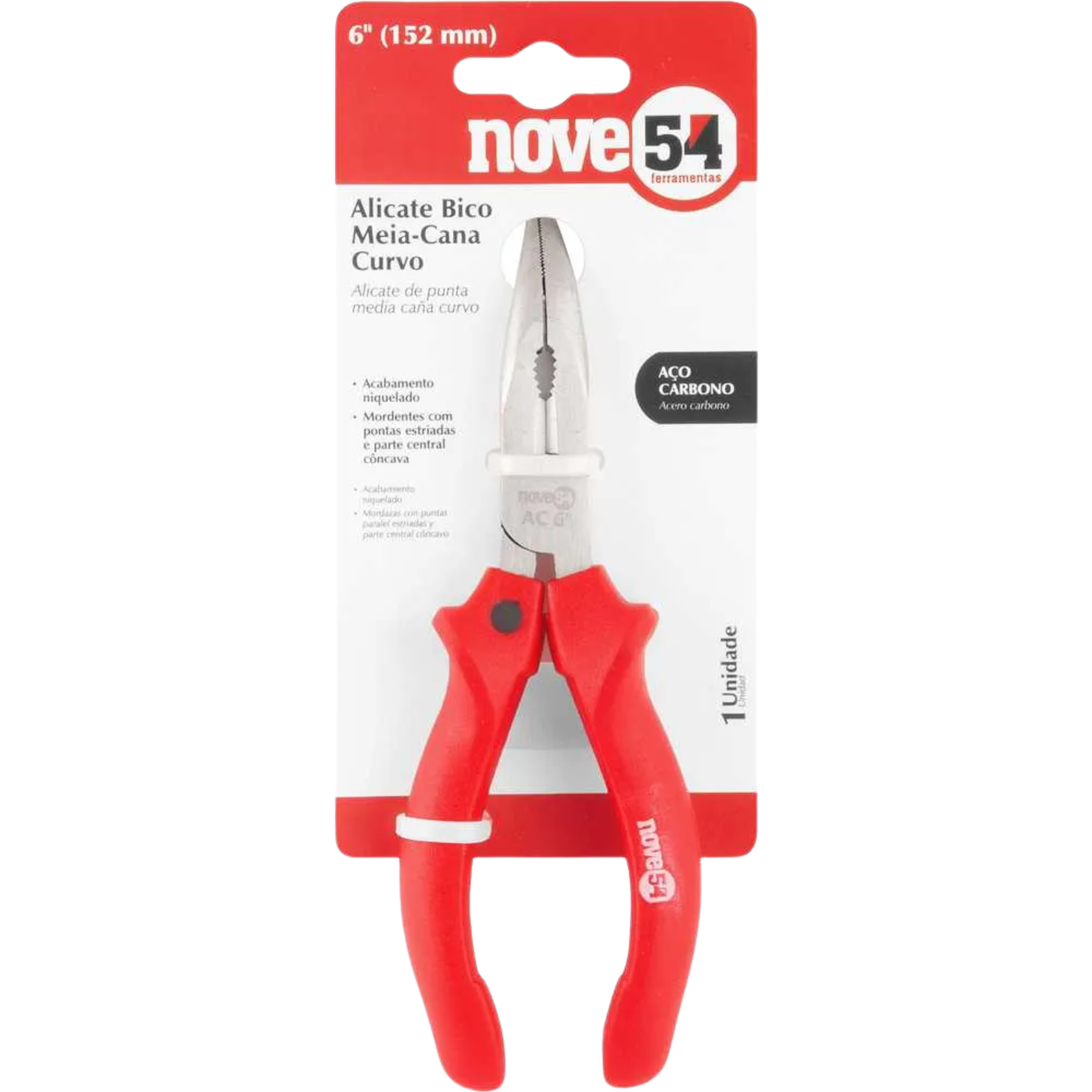 Alicate Bico Meia Cana Curvo 6 – Nove54, é utilizada para serviços de mecânica e de eletricidade para corte e torção de cabos, fios e arames. Possui acabamento niquelado e cabo anatômico com abas de proteção, proporcionando maior segurança durante o uso.