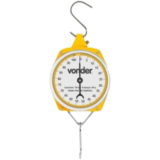 Confeccionada em plástico resistente e metal. Acompanha gancho para prender o material ou alimento a ser pesado.