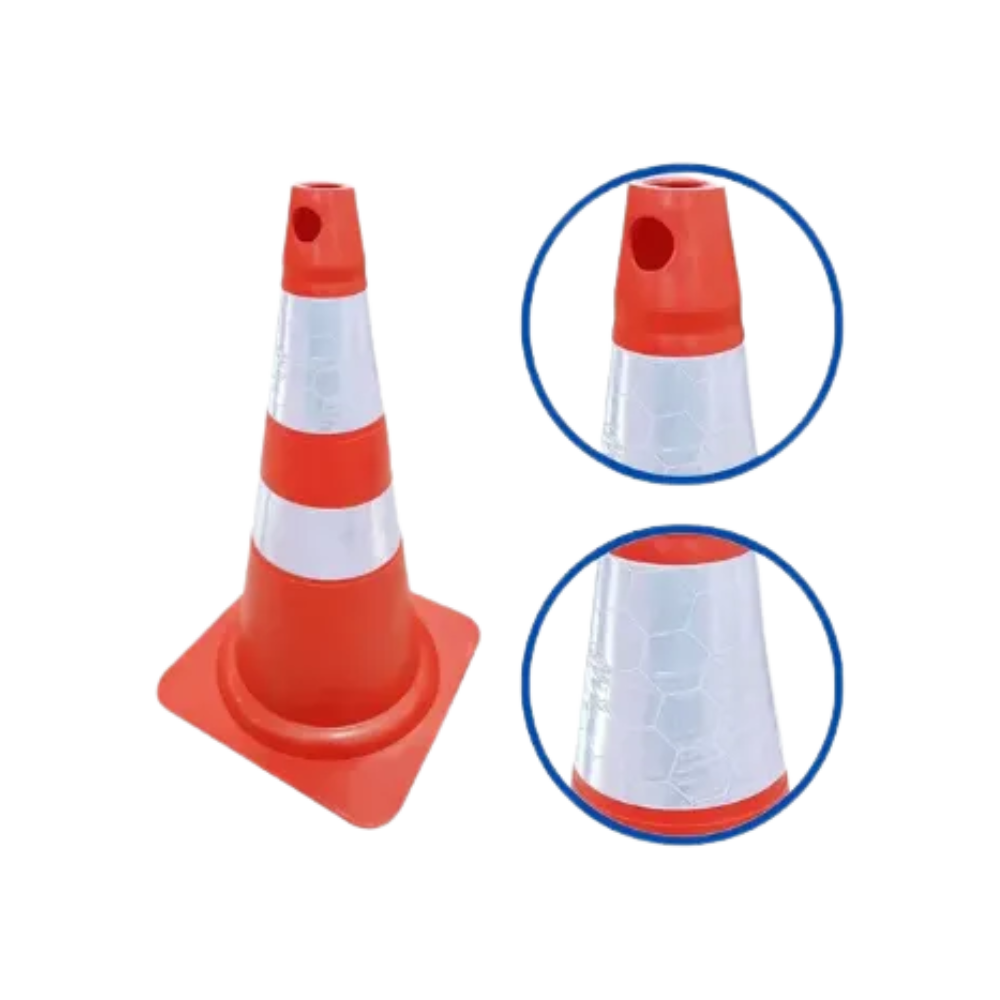 Cone injetado em PVC, possui duas faixas refletivas nas cores branca ou amarela, as faixas são confeccionadas em PVC prismático com espessura de 0,2 mm, e com forro de PVC com espessura de 0,1 mm.