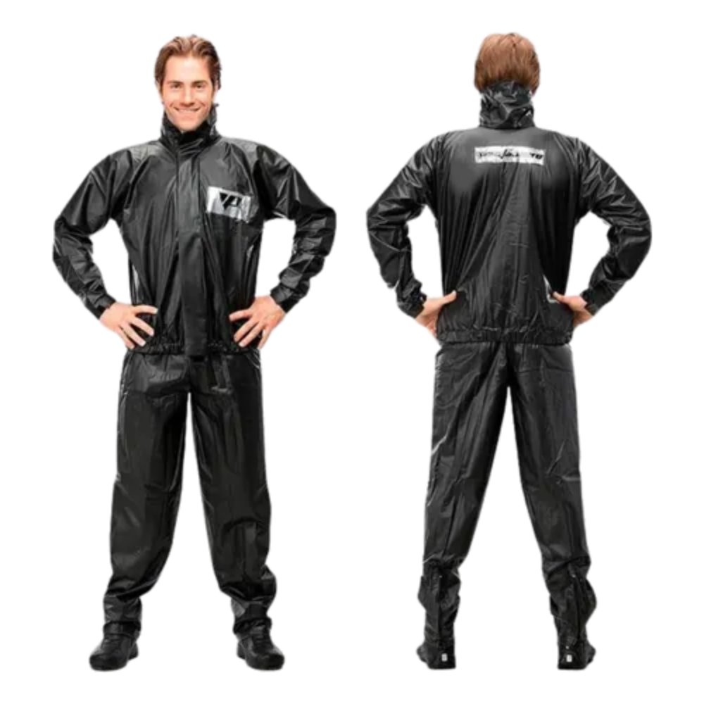 Jaqueta com bolso interno, cintura ajustada com elástico e punhos com elástico e velcro. Fechamento frontal com zíper e velcro. Refletivo nas costas e no velcro da calça. Com gola.