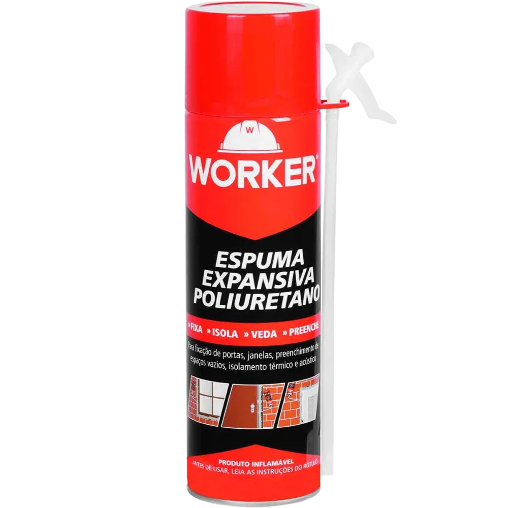 A Espuma Expansiva de Poliuretano WORKER é utilizada para fixação, preenchimento de espaços vazios, isolamento térmico e acústico. Ideal para a fixação de batentes de portas e janelas, também pode ser utilizada para a fixação de caixas de ar condicionado e caixas elétricas. Aplicada também para preencher, fixar e isolar rasgos e fissuras em paredes para tubulação de água quente e fria. Adere a vários materiais, como madeira, alvenaria, PVC, cerâmica, alumínio e ferro. A espuma expansiva de poliuretano não é recomendada para ser utilizada em politetrafluoretileno, polietileno e polipropileno. Benefícios da Espuma Expansiva Poliuretano Worker:– Adere a madeira alvenaria, PVC, cerâmica, alumínio e ferro.