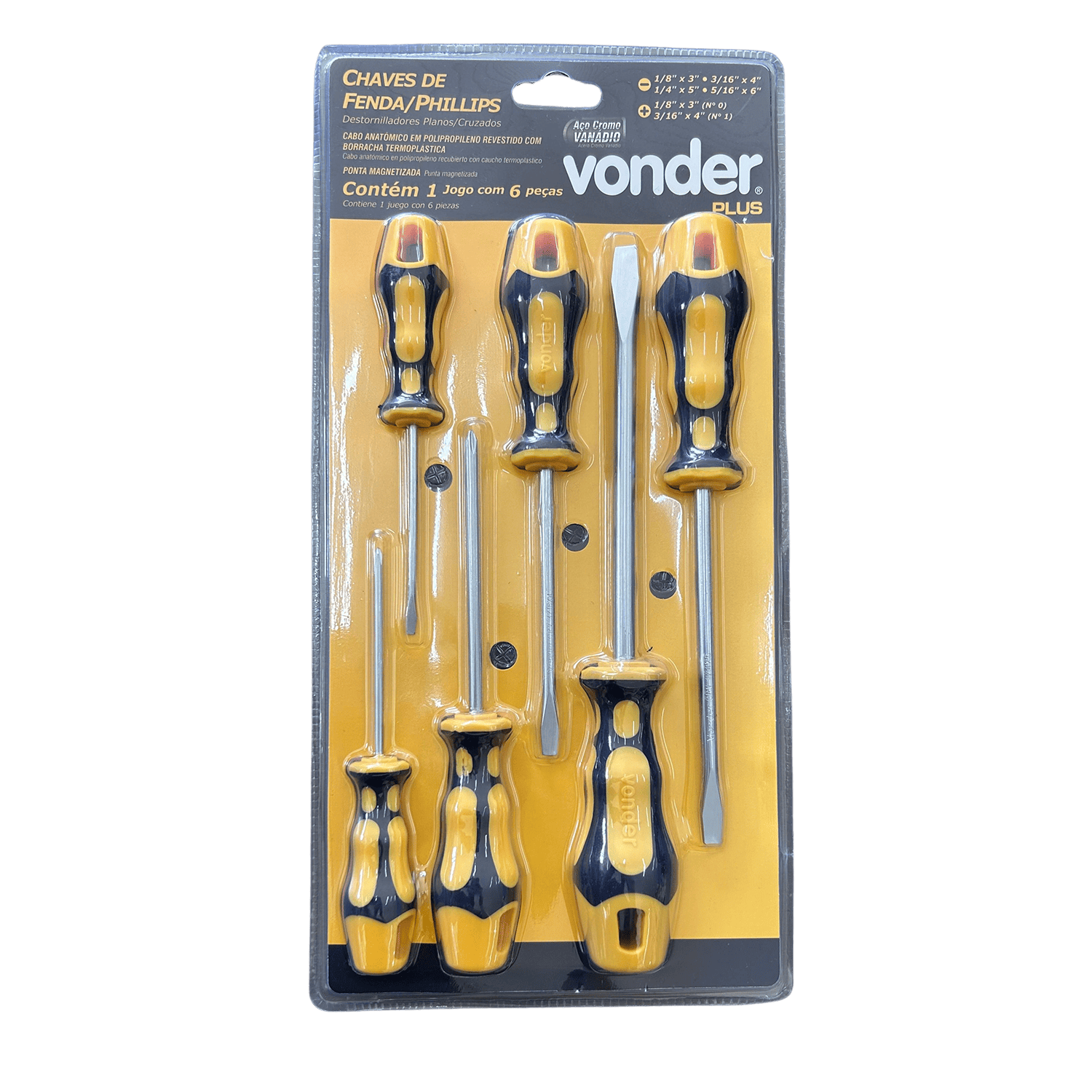 1 Jogo de chaves de fenda/phillips composto por 6 peças, sendo: 1 chave de fenda 1/8″ x 3″, 1 chave de fenda 3/16″ x 4″, 1 chave de fenda 1/4″ x 5″, 1 chave de fenda 5/16″ x 6″, 1 chave phillips 1/8″ x 3″ e 1 chave phillips 3/16″ x 4″.