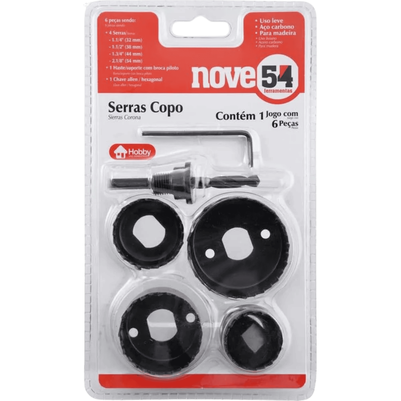 4 serras: 32 mm – 1.1/4”, 38 mm – 1.1/2”, 51 mm – 2”, 54 mm – 2.1/8”