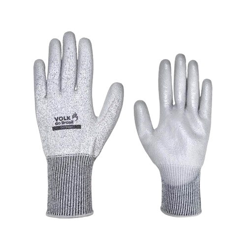Luva de segurança confeccionada em fios de HPPE (polietileno de alta performance), revestimento da face palmar e ponta dos dedos em poliuretano (PU), punho com inserções de fibras elásticas e acabamento em fibras sintéticas.