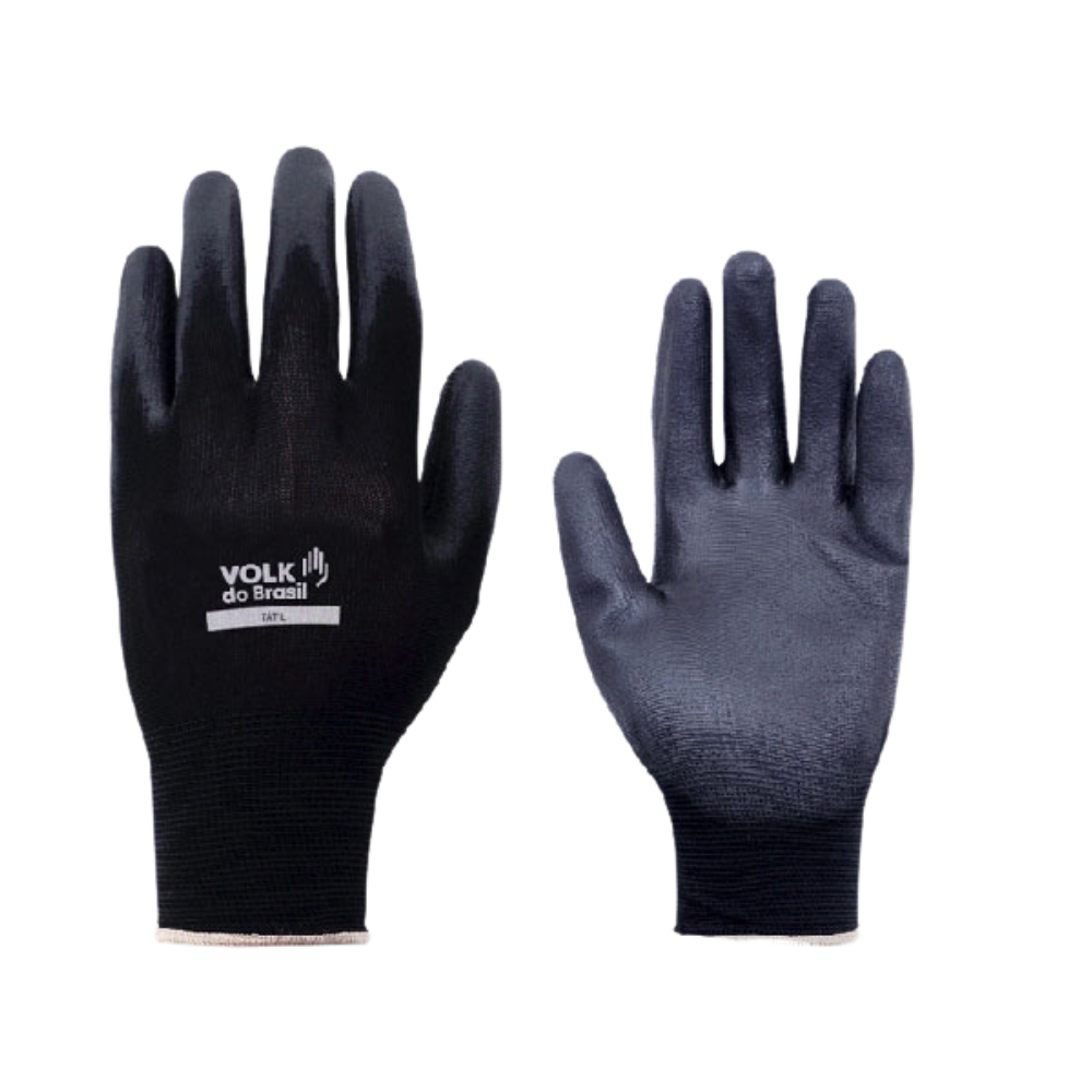 Luva de segurança confeccionada em fibras sintéticas, revestimento da face palmar e ponta dos dedos em poliuretano (PU), punho com inserções de fibras elásticas e acabamento em fibras sintéticas.