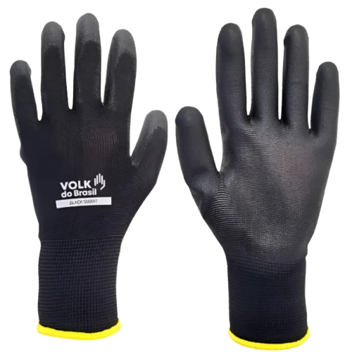 Luva de segurança confeccionada em fibras sintéticas, revestimento da face palmar e ponta dos dedos em poliuretano (PU), punho com inserções de fibras elásticas e acabamento em fibras sintéticas.