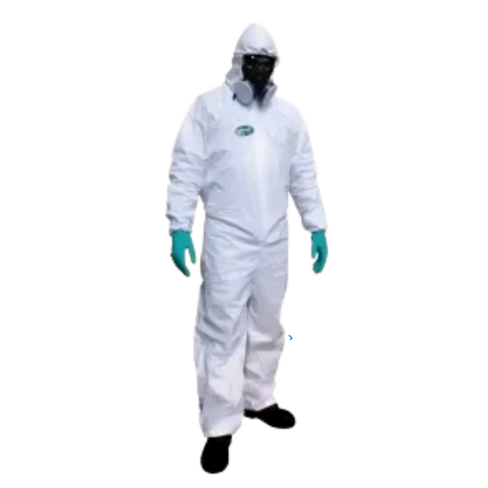Vestimenta de segurança, tipo macacão, confeccionada em polipropileno (não tecido) laminado, com filme de polietileno, fechamento frontal com zíper e pala de proteção, elástico no capuz, punho e tornozelos. Para proteção do crânio, pescoço, tronco, membros superiores e inferiores do usuário contra risco de de origem química.