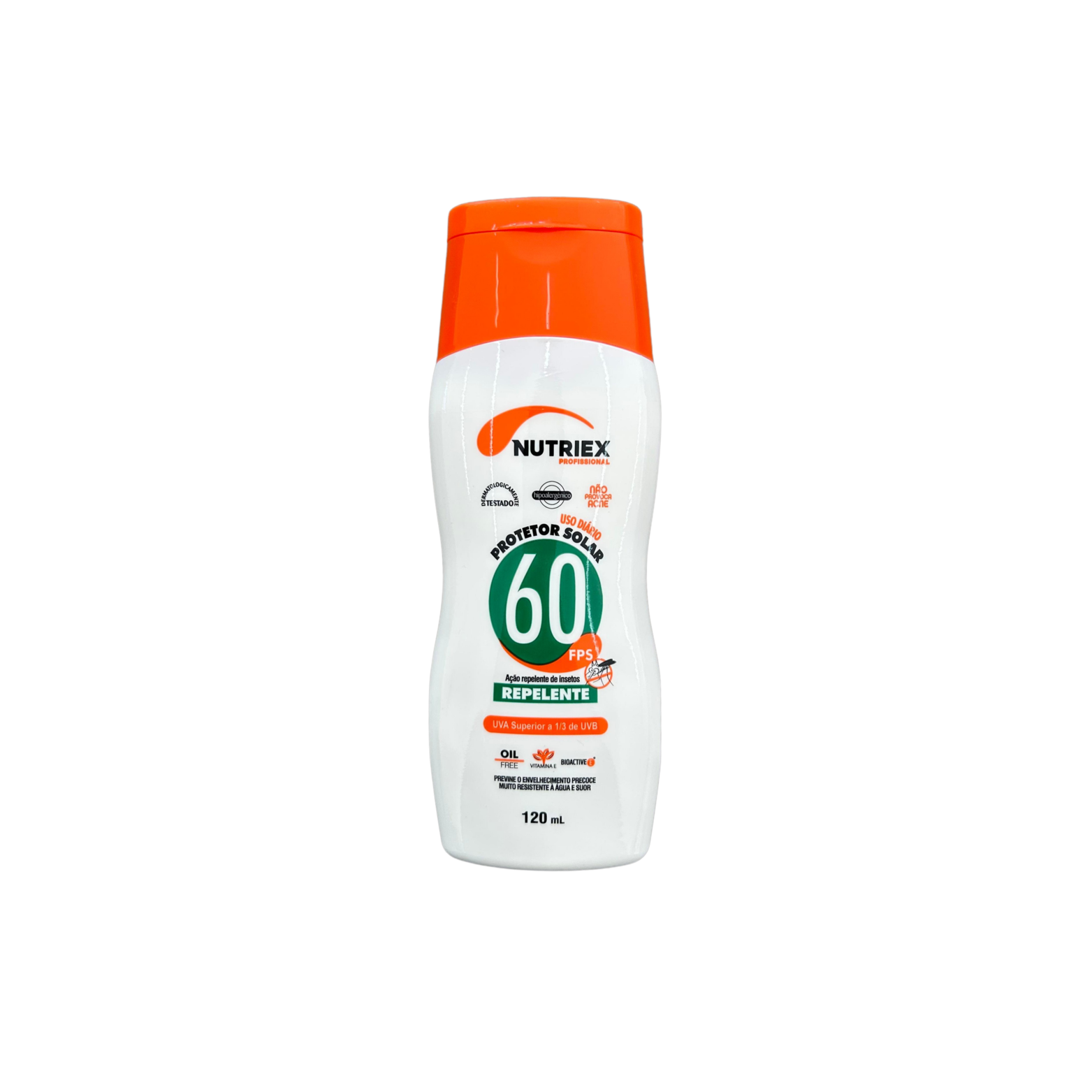 O PROTETOR SOLAR FPS 60 REPELENTE NUTRIEX PROFISSIONAL oferece muito alta proteção à pele contra os efeitos nocivos da radiação solar, prevenindo as queimaduras solares, além de proteger contra os mosquitos. Com toque seco e fácil espalhabilidade, não deixa a pele esbranquiçada e possui aplicação rápida e prática. Contém Bioactive, poderoso que previne o envelhecimento precoce. Além disso, minimiza os danos na pele causados pelos raios infravermelhos devido à ação do produto.
