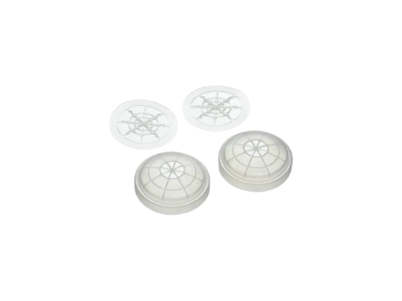 Conjunto Retentor (1 par) e Tampas tipo aranha para posicionar o filtro P2 sobre os cartuchos químicos Série N na máscara. As combinações de filtro e cartucho possuem um perfil baixo com parte superior curva para não prender em tubos ou outros objetos. Teste de vedação fácil de realizar pelo usuário, mesmo nos cartuchos de vapores e gases.