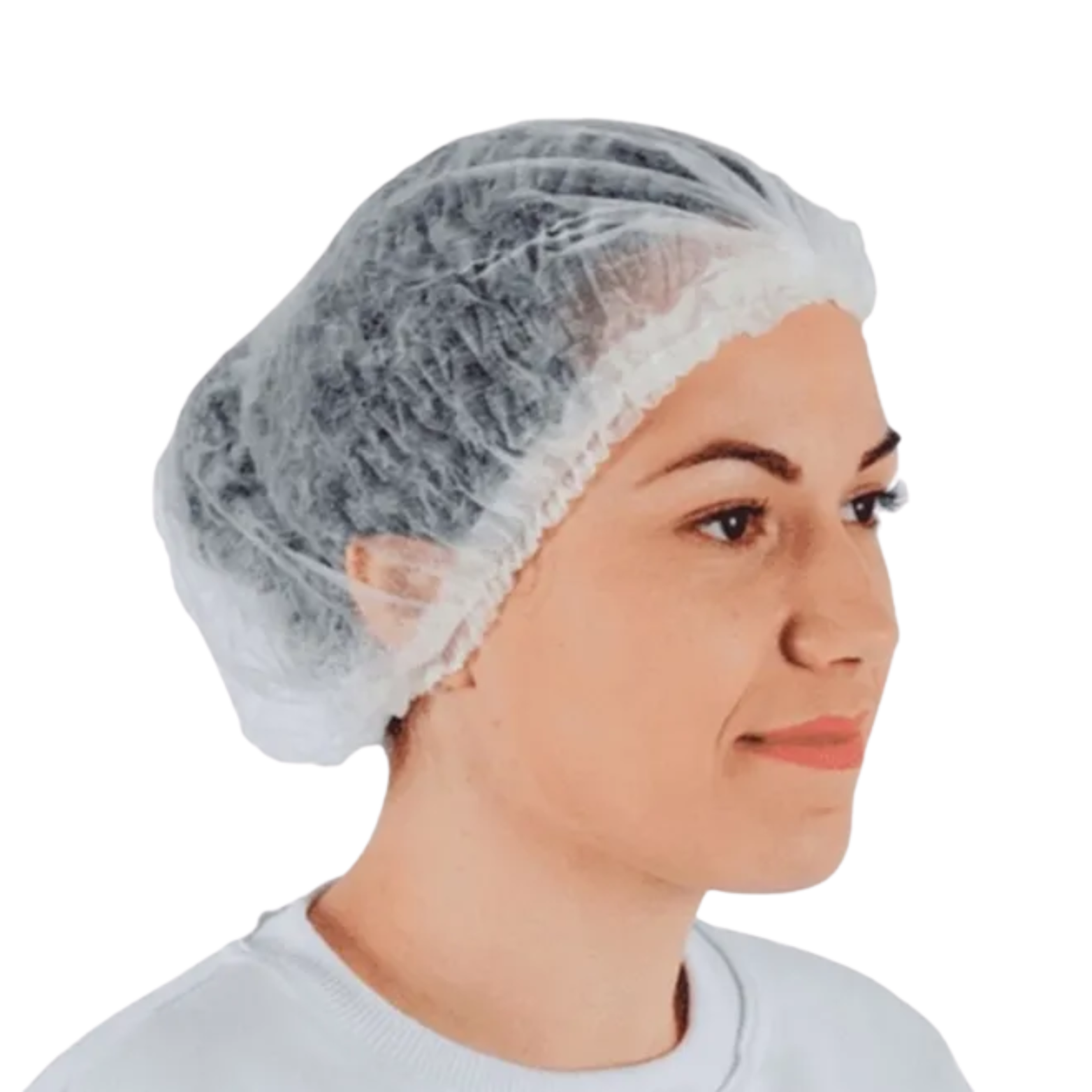 Touca sanfonada descartável confeccionada em TNT de estrutura flexível, plana e porosa.
